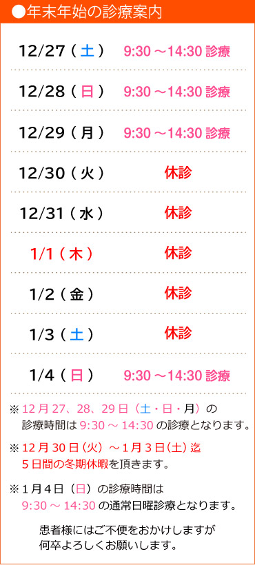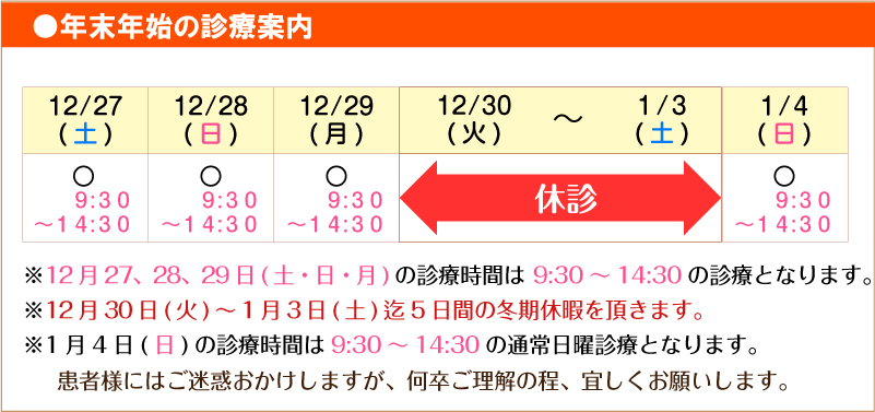 12月27、28、29日(土・日・月)の診療時間は 9:30~14:30の診療となります。